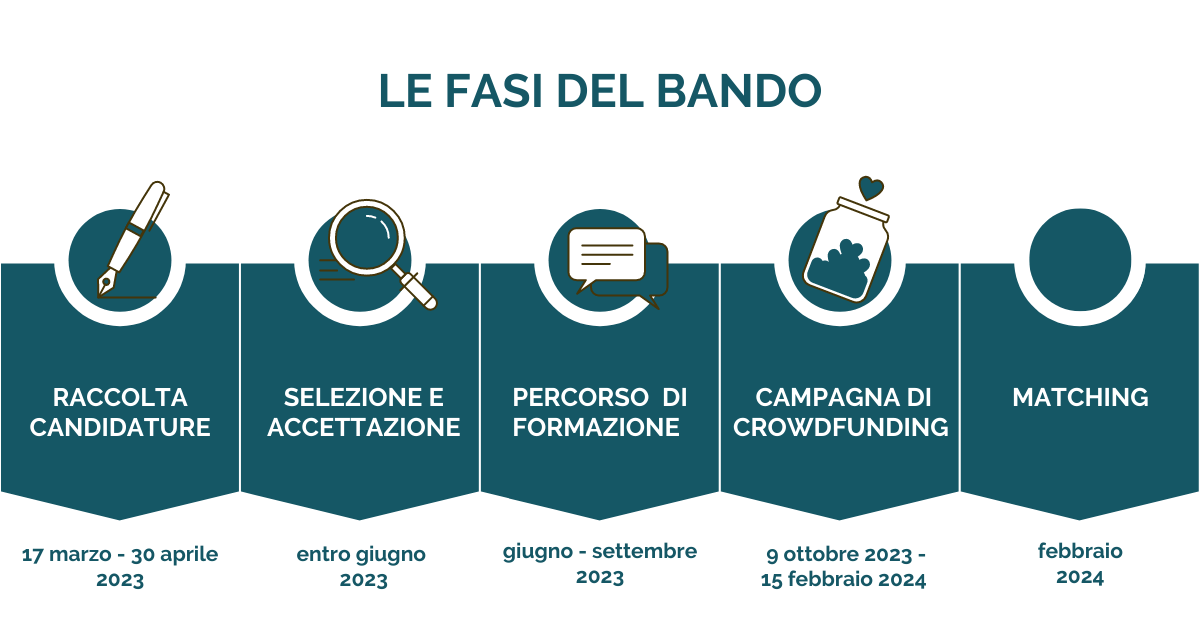 Il bando prevede due fasi, l’accesso alle risorse (fase 2) è subordinato alla formazione obbligatoria relativa a crowdfunding e raccolta fondi (fase 1).
